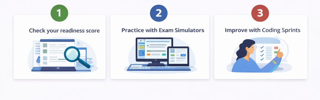 The best way to prepare is by combining practice exams, coding drills, and targeted study of weak areas. Tools like readiness tests, coding sprints, and timed practice exams can help build speed and confidence before exam day.