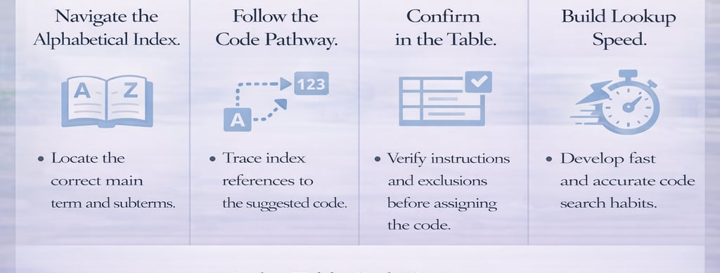 This skill is essential for exams like the CPC and for real-world coding because coders do not start with the table — they start with the index.