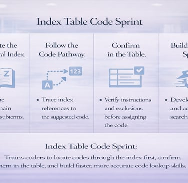 The Index-Table-Code Sprint is designed for CPC® exam candidates and medical coding learners who want to improve their ability to move through the coding manuals in the correct order and with greater confidence. This sprint is especially helpful for students who understand some coding concepts but still get tripped up on the process of starting in the index, moving to the table or tabular section, and then confirming the final code selection. It is a strong fit for beginners who are still learning proper code lookup habits, as well as for more experienced learners who want to improve speed, reduce errors, and stop second-guessing themselves during exam-style questions. If you have ever known the answer was somewhere in the book but struggled with how to get there efficiently, this sprint is built for you.